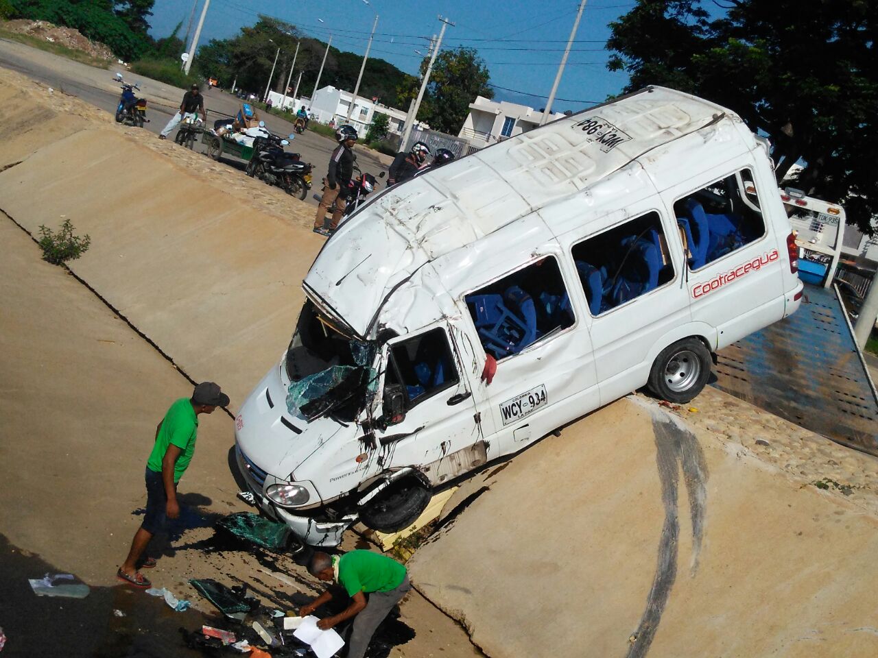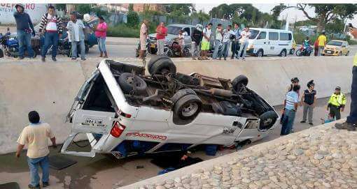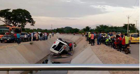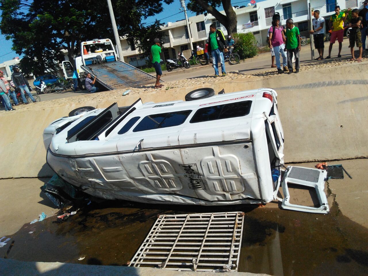 Aparatoso accidente de buseta en canal del barrio Los Milagros. Por evitar colisionar contra una motocicleta que circulaba en contravía por la carrera 39 con carrera 5 A, una buseta afiliada a Cootracegua, se fue al fondo del canal pluvial en sectores del barrio Los Milagros, en el sur oriente de Valledupar.