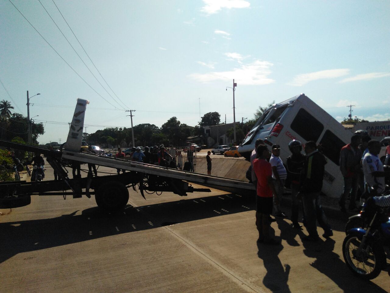 La buseta se fue al fondo del canal, lo que le ocasionó fuertes daños en toda la carrocería. Las autoridades no informaron que pasó con el conductor de la motocicleta.