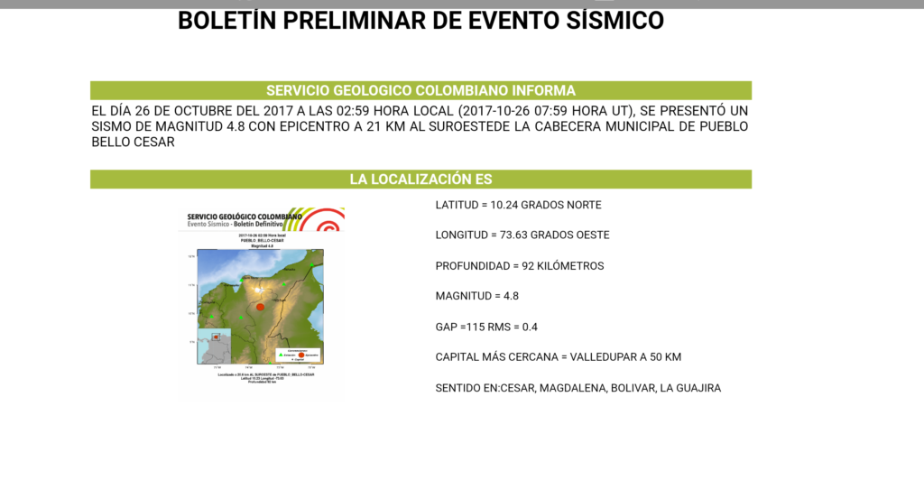 La Red Sismológica Nacional de Colombia reportó que «el día 26 de octubre del 2017, a las 2:59 hora local, se presentó un sismo de magnitud 4.8 con epicentro a 21 kilómetros al suroeste de la cabecera municipal de Pueblo Bello, Cesar».