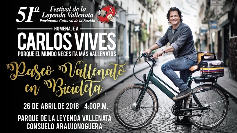 Carlos Vives en bicicleta por las calles de Valledupar. El 51° Festival de la Leyenda Vallenata que rinde homenaje al artista Carlos Vives, realizará el Paseo Vallenato en Bicicleta, que se llevará a cabo este jueves 26 de abril a partir de las 4:00 de la tarde partiendo del Parque de la Leyenda Vallenata ‘Consuelo Araujonoguera’, para recorrer las principales calles y avenidas de la ciudad, hasta llegar a la Plaza Alfonso López, donde posteriormente se realizará el Conversatorio ‘Vives en el Festival’.